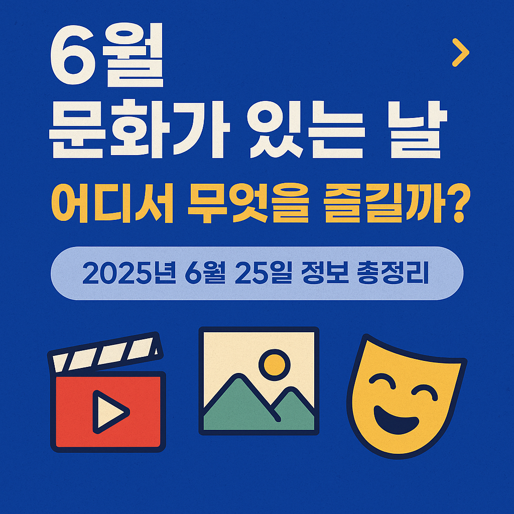 매달 마지막 주 수요일은 문화가 있는 날입니다. 2025년 6월은 6월 25일(수요일)이 해당되며, 전국 곳곳에서 다양한 문화 할인 혜택과 체험 행사가 진행됩니다. 특히 서울과 수도권 지역 중심으로 공연, 전시, 영화 등 폭넓은 문화 콘텐츠를 누릴 수 있는 기회입니다.